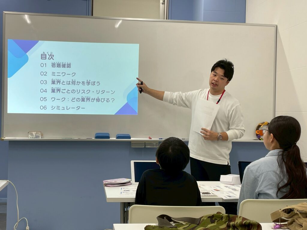 授業の後半では、毎回「株式売買シミュレータ」という、実際の株価に連動したシステムを用いてお金を使わずに投資体験を行っています。例えば、業界について勉強した授業では、気になった業界の中から1社選んで株を買ってみることで、マクロ⇒ミクロの視点で学べるカリキュラムとなっています。