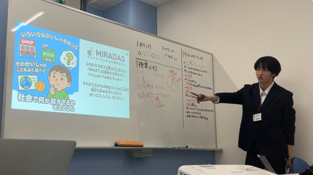 生徒の好きなものから、身の回りの物やサービスが会社によって作られていることを学びました。会社が活動を続けるためには、人・アイデア・お金が必要であり、その中で株式投資は会社をお金で応援する仕組みであることを、クイズ形式で分かりやすく伝えました。